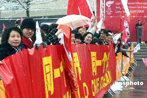 圖為中國(guó)留學(xué)生在溫布利體育場(chǎng)外為奧運(yùn)圣火助威。 沈晨 攝