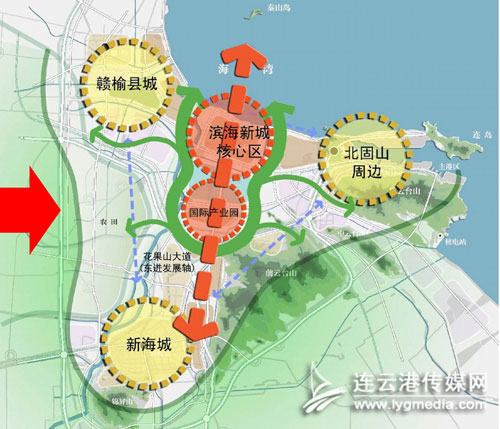 一心三極的內(nèi)涵是,以連云港新海城區(qū)、東部城區(qū)、贛榆城區(qū)形成相互聯(lián)動(dòng)的三大增長(zhǎng)極,而位于三極之間的海濱新區(qū)是未來最為重要的城市核心。