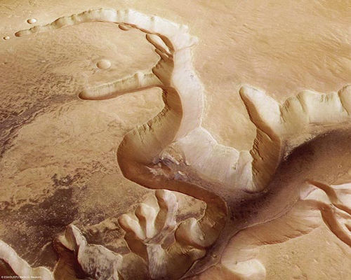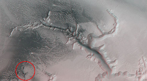 兩個(gè)沖擊坑直徑約8公里,位于巖脈東南方。東邊的沖擊坑已經(jīng)被部分侵蝕,成為峽谷,巖屑已被沖走。