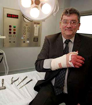 他憶述說:“我用了三十秒左右催眠自己,之后便全身都失去了知覺,除了(右)臂。我感覺到手術師為我做推拿──然后便聽見骨頭裂開的聲音。我聽見他說,‘可以拿那把鋸子給我嗎?’,然后我想象出他手中持著那把大得可以的東西。不過幸好他接著說:‘我想我們要用那把較小的器具!欢葘ξ矣皱N又鑿,我當時聽見一段反復錘擊的聲響。他對助手和麻醉師說的話都給我聽見了,不過他們沒說什么閑言?上О々ぉの疫以為可以聽到些刺激的東西呢!眰悇P伊現(xiàn)正在妻子陪同下在家休養(yǎng)。