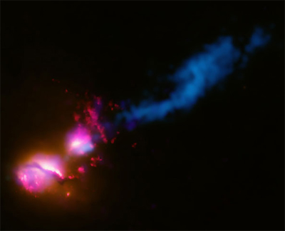 這個(gè)噴射能量的稍大一點(diǎn)的星系被天文學(xué)家稱為死亡星系,其中心部分的黑洞附近噴射出一股高能量粒子與磁場(chǎng),噴射區(qū)寬有一千個(gè)光年,其威力之大,任何星球上的類似生命的東西都無(wú)法抵御。較小的星系被速度達(dá)光速的粒子擊中的地方顯示出亮光。