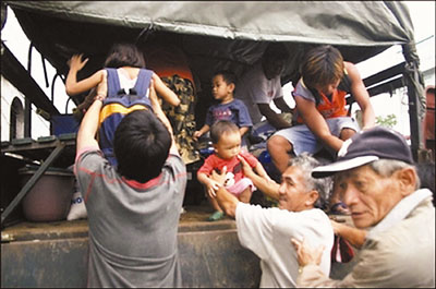 平板貨車、警方特許客貨車,甚至垃圾車均被征用接載災(zāi)民離開(kāi)(見(jiàn)圖)?偨y(tǒng)阿羅約夫人縮短新加坡訪問(wèn)回國(guó)。