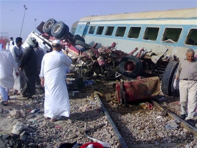埃及火車(chē)與汽車(chē)相撞事故現(xiàn)場(chǎng)。