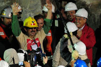 】智利圣何塞銅礦8月5日發(fā)生礦難,33名礦工在井下約700米深處被困超過2個月。經(jīng)過設(shè)計方案、挖掘隧道等一系列準備工作,最后階段的救援于當?shù)貢r間12日晚展開。智利總統(tǒng)以及多名智利官員到場迎接礦工出井。北京時間13日上午,首名升井礦工弗洛倫西奧•阿瓦洛斯搭乘特制救生艙回到地面,成功獲救,為最后階段拯救行動揭開序幕,所有被困礦工將被逐一送上地面,重獲新生。