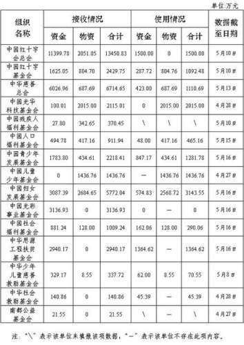 截至5月16日,中國紅十字會總會和14家在民政部登記的社會組織向民政部報送了救災捐贈統(tǒng)計數(shù)據(jù)。