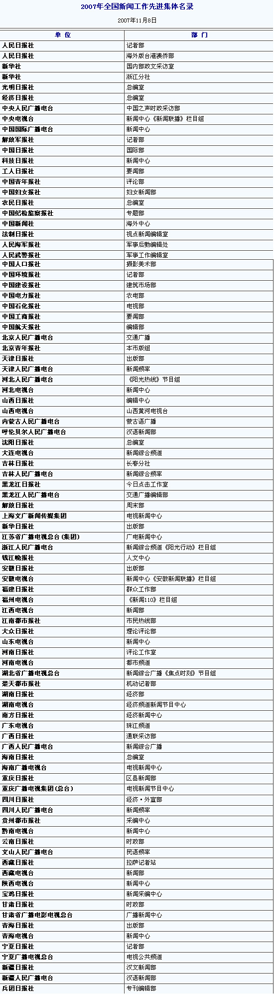 2007年全國新聞工作先進集體名錄