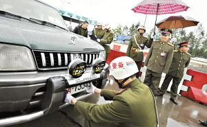 使用迷彩布遮蓋軍車號(hào)牌的行為將受到查處。昨日,廣州警備區(qū)協(xié)調(diào)陸、海、空軍、武警和公安,組織開(kāi)展了打擊假冒軍車行動(dòng)。廣東省軍區(qū)副參謀長(zhǎng)閻學(xué)亭,廣州警備區(qū)司令員顏小明和參謀長(zhǎng)張?jiān)粕,?lái)到現(xiàn)場(chǎng)進(jìn)行指導(dǎo)。昨日早上在廣氮收費(fèi)站的查車點(diǎn),執(zhí)勤人員扣押了9輛冒牌軍車。