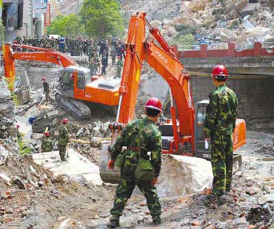 5月15日,記者看到,中國人民解放軍第二炮兵及北京路橋、四川路橋和華西集團(tuán)的挖掘機(jī)、推土機(jī)等重型施工機(jī)械經(jīng)過長途開進(jìn),突入北川,立即投入,晝夜不停。四臺挖掘機(jī)在探照燈照射下,緊張施工,機(jī)械手輪流操作,機(jī)器徹夜不停轉(zhuǎn)。