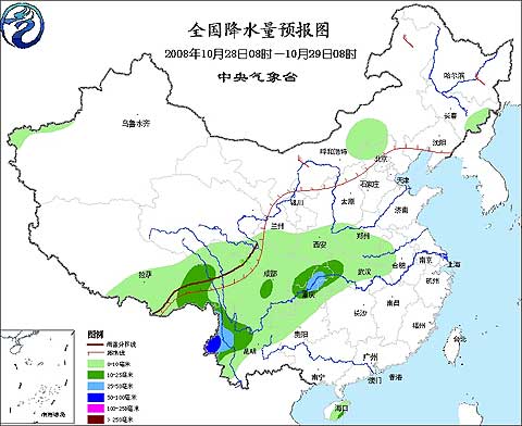 2008年10月28日08時(shí)—10月29日08時(shí)全國(guó)降水量預(yù)報(bào)圖