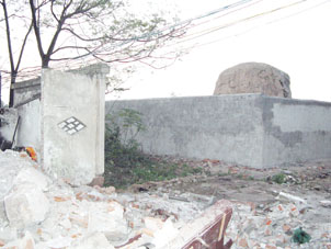 記者趕到鄂州那天,已是日暮時(shí)分。在當(dāng)?shù)鼐用竦闹敢,記者才找到摩崖石刻。只?jiàn)一塊褐色的石頭,已被兩米高的水泥墻圍了起來(lái)。鏡頭稍微拉開(kāi)一點(diǎn),這個(gè)國(guó)家重點(diǎn)保護(hù)文物四周,便是拆遷后的殘?jiān)珨啾,廢棄的磚頭、鋼筋、破布散落一地。冬日夕陽(yáng)的斜照下,一片蕭索。