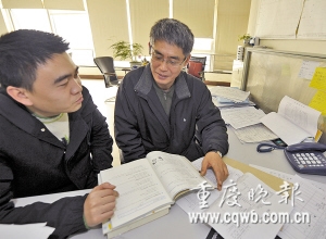 安順基(右)向同事學(xué)習(xí)漢語 記者 冉文 攝
