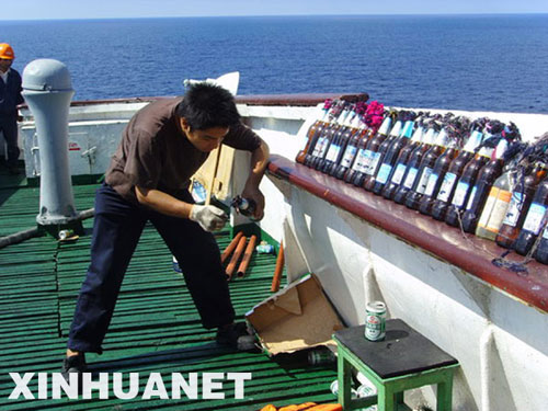 新華軍事特派記者朱鴻亮在"武漢"號驅(qū)逐艦上發(fā)回最新的連線報道。