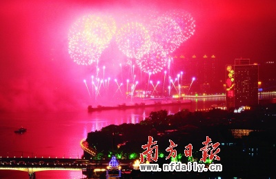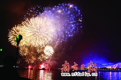今年燃放的煙花新穎別致。許多曾在北京奧運會開閉幕式上令世界驚艷的煙花表演品種昨日在廣州匯聚一堂,貫穿整個晚會。