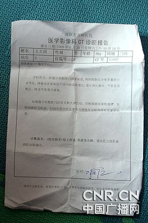 說話的人叫鐘家泉,是這群農(nóng)民工的代表,記者見到他是在深圳市郊的一處簡易房內(nèi),包括廁所在內(nèi),房間面積不超過10平米,而這里卻住著他的10多位工友,地上沒有床,救濟站提供的棉被是房間里唯一的家具。這些人有的因為病痛已經(jīng)無法工作,有的因為疑似塵肺而被包工頭辭退,難聞的氣味和對死亡的恐懼彌漫著整個房間。他們因為職業(yè)病檢查受阻而走到一起,目前已有120多人。他們都有不同程度的咳嗽、胸悶、呼吸困難等癥狀。工人們說,十多年來他們一直在深圳當炮工,每天都要吸入大量粉塵,但以前并不知道這會危及生命。他們說,自己已經(jīng)有兩三個老鄉(xiāng)死了,死掉的時候他們都親眼看到了,現(xiàn)在感覺自己的身體和死掉人的癥狀幾乎相同。而一位在湖南張家界中醫(yī)院做過檢查的工友說:醫(yī)生照出來一看,說這個病很嚴重,最后,我跟他說明了,我說我打了幾十年風鉆,他說肯定是塵肺病。