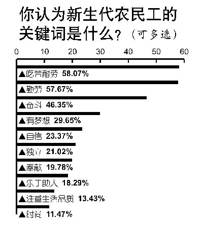 雖然專家指出,新生代農(nóng)民工具有“三高一低”的特征,即受教育程度高,職業(yè)期望值高,物質(zhì)和精神享受要求高,工作耐受力低。但本次調(diào)查中,當問到新生代農(nóng)民工的關(guān)鍵詞,“吃苦耐勞”仍以58.1%的支持率排名第一,“勤勞”以57.7%的支持率緊隨其后,排在第三位的是“奮斗”(46.4%)。