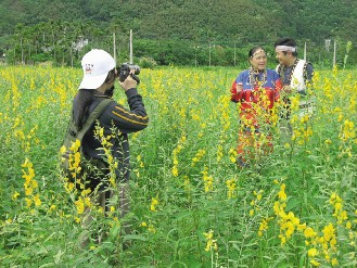 部分游客專程到秀林鄉(xiāng)記錄太陽麻花海景觀,身穿原住民賽德克族傳統(tǒng)服飾,置身在黃花綠葉的花海間,手持?jǐn)z影機拍攝東海岸綠肥作物。