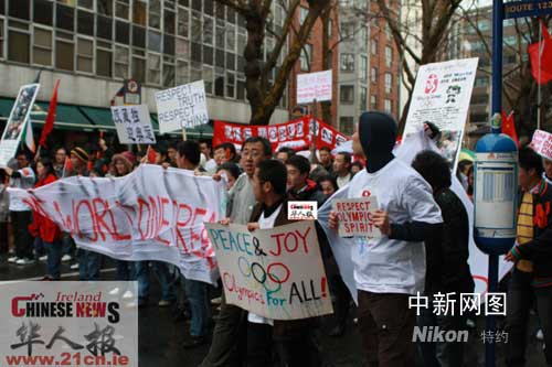 游行隊(duì)伍中最搶眼,人氣也最旺的是一位白發(fā)蒼蒼的愛爾蘭大叔!只見他頭戴繡有奧運(yùn)吉祥物的鴨舌帽,身披奧運(yùn)五環(huán)旗,手持中國小國旗。記者與這位名叫Vincent Lavery的老人交談后,得知他是一名旅居美國的愛爾蘭人,曾于上世紀(jì)80年代去過中國。從那時(shí)起,他就開始關(guān)注中國的情況。在對中國的飛速發(fā)展感到吃驚的同時(shí),也對中國引領(lǐng)世界經(jīng)濟(jì)潮流寄予厚望。當(dāng)談到“藏獨(dú)”問題和北京奧運(yùn)時(shí),他說:“我們今天以和平的方式來表達(dá)我們的真心,而‘藏獨(dú)’分子卻以肆意打砸搶燒來換取憐憫!天底下居然有如此猖狂的暴徒!究其原因,還是受人指使,蠱惑人心,破壞奧運(yùn)!奧林匹克精神是屬于全世界人民的!是不容被玷污的!”親切的面容,真摯的理解,帶給在場華人無盡的感動(dòng)!