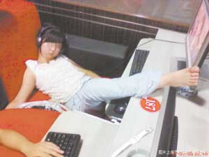 在這些被張貼出來的照片中,記者看到,有個漂亮妹妹戴著耳機不知道是在瞇著眼睛聽音樂還是已經(jīng)睡著了,一條腿放在電腦桌上;大多數(shù)上網(wǎng)者要么蜷縮在沙發(fā)上要么就坐在凳子上酣然熟睡;有的上網(wǎng)者手放在鍵盤上,可眼睛卻已經(jīng)閉上,嘴巴大張著;還有的則是男女混合躺在一起,任憑電腦屏幕閃個不停。