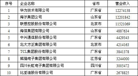 據(jù)資料顯示,華為以年?duì)I業(yè)收入1227億元位居榜首,海爾以1220億元位列第二,聯(lián)想以1152億元排在第三。位于第四到第十名的企業(yè)分別是:海信、中興、北大方正、TCL、熊貓電子、四川長(zhǎng)虹、比亞迪。