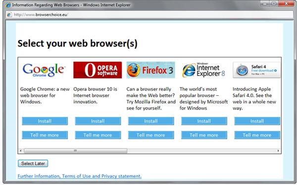 根據(jù)微軟和歐盟達(dá)成的協(xié)議,微軟同意在Windows 7中捆綁IE瀏覽器的同時(shí),還提供其他瀏覽器安裝選項(xiàng),而這些瀏覽器的排列順序是隨機(jī)的。