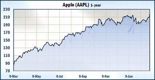 受蘋果宣布iPad發(fā)售日期的影響,公司股價(jià)上周五創(chuàng)下了219.70美元的歷史新高,打破了今年1月5日創(chuàng)下的215.59美元的最高紀(jì)錄。