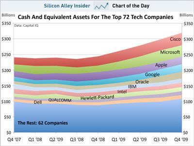 Capital IQ數(shù)據顯示,這10大科技公司擁有2100億美元現(xiàn)金和等價物,在過去2年中,這10家科技公司的現(xiàn)金和等價物增加了687億美元。