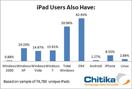 Chitika對7萬多名iPad用戶進(jìn)行了調(diào)查,結(jié)果發(fā)現(xiàn)有50.96%的用戶使用Windows系統(tǒng)。當(dāng)然,使用Mac OS系統(tǒng)的iPad用戶略占上風(fēng),比例為62.95%(部分用戶使用雙系統(tǒng))!