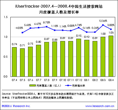 近日,艾瑞咨詢發(fā)布國內(nèi)首部《中國生活搜索行業(yè)市場研究報(bào)告》。報(bào)告顯示,截至2008年4月,國內(nèi)生活搜索覆蓋人群已經(jīng)超過1.03億,較去年同期增幅39%,超過網(wǎng)絡(luò)游戲用戶數(shù)量5700萬,已經(jīng)成為中國網(wǎng)民上網(wǎng)的主流應(yīng)用。