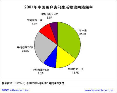 國家工業(yè)和信息化部公布的信息顯示,截至08年2月份,我國網(wǎng)民數(shù)達(dá)2.21億人,超過美國居全球首位。而截至2008年4月,國內(nèi)生活搜索覆蓋人群已經(jīng)超過1.03億,較去年同期增幅39%。在口碑網(wǎng)上完成的對網(wǎng)民調(diào)查顯示,約有59.2%的用戶每周至少訪問一次生活搜索網(wǎng)站,查找生活服務(wù)商家的信息或發(fā)布相關(guān)生活服務(wù)需求,其中將近24.9%的用戶幾乎每天都會訪問生活搜索網(wǎng)站,僅有不到4成的用戶沒有確定的訪問習(xí)慣。報(bào)告認(rèn)為,正是基于用戶對于本地生活信息的需求促使生活搜索網(wǎng)站的出現(xiàn)。從目前訪問次數(shù)看,生活搜索網(wǎng)站已成為眾多網(wǎng)民日常生活比較依賴的工具之一。
