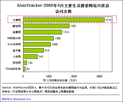 報(bào)告指出,經(jīng)過幾年的發(fā)展,國內(nèi)生活搜索發(fā)展的格局日趨明朗,口碑網(wǎng)、酷訊、趕集網(wǎng)等網(wǎng)站逐漸脫穎而出。其中,借助阿里巴巴集團(tuán)強(qiáng)勁的資源優(yōu)勢,2004年成立的口碑網(wǎng)已發(fā)展成國內(nèi)最大的生活搜索網(wǎng)站。其用戶月度總訪問次數(shù)3194萬次,幾為第2位的酷訊網(wǎng)1821萬次和第3位趕集網(wǎng)1516萬次的總和。在人均月度訪問次數(shù)上,口碑網(wǎng)也以1.85次居榜首。