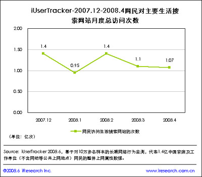 調(diào)查顯示,2007年12月用戶對生活搜索網(wǎng)站的月度總訪問次數(shù)為1.04億次,2008年1月份顯著下降,為0.66億次,艾瑞考察整體網(wǎng)民總體的訪問次數(shù)發(fā)現(xiàn),出現(xiàn)這一現(xiàn)象的原因在于網(wǎng)民的總體訪問次數(shù)整體呈下降趨勢,主要受元旦和春節(jié)等節(jié)假日影響;此后網(wǎng)站訪問總次數(shù)呈穩(wěn)步上升趨勢。
