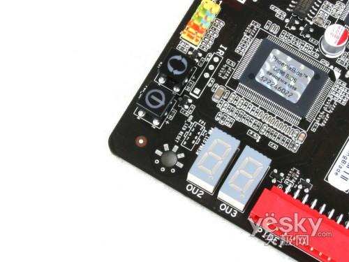 富士康FLAMING BLADE提供了電源、重啟按鈕和D-BUG指示燈,方便玩家在打開機(jī)箱進(jìn)行調(diào)試的時(shí)候開關(guān)機(jī)、重啟和排除系統(tǒng)故障。