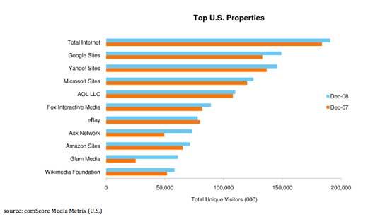 約翰·多納霍(John Donahoe)2008年一季度執(zhí)掌eBay后提倡“大幅更換產(chǎn)品、消費(fèi)方式和業(yè)務(wù)模式”,在與亞馬遜和谷歌的失敗競爭中,eBay領(lǐng)導(dǎo)層徹底放棄了殘存的娛樂元素。2008年12月,eBay占網(wǎng)民網(wǎng)絡(luò)瀏覽時(shí)長比率僅為1.5%。按獨(dú)立訪問者數(shù)量排名,靠前的網(wǎng)站分別是谷歌(YouTube母公司)、?怂够(dòng)傳媒(MySpace母公司)等,eBay僅列第六位,與2007年12月數(shù)據(jù)相比,是十大網(wǎng)站中唯一出現(xiàn)排名下滑的網(wǎng)站。(見圖)