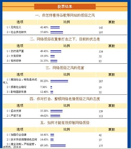 調(diào)查一推出就受到了的網(wǎng)民關(guān)注,他們積極參與投票和留言。截至目前,55.38%的網(wǎng)友選擇了堅(jiān)決支持打擊、整頓網(wǎng)絡(luò)色情低俗之風(fēng);69.14%的網(wǎng)友投票要求有關(guān)部門“健全法制,嚴(yán)格監(jiān)管,該罰罰,該關(guān)關(guān)”。