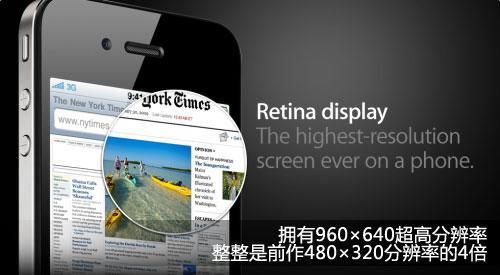毫無疑問,iPhone4硬件層面的最大亮點(diǎn)之一,則是其號稱“Retina Display”的顯示屏幕,其官方稱,該屏幕擁有960×640超高分辨率,是480×320分辨率的4倍,也就是說,iPhone4一屏可顯示的內(nèi)容量是iPhone3的四倍。即使是目前一些高端Android平臺的手機(jī),最高分辨率也只有854×480,與其仍有不小的差距。