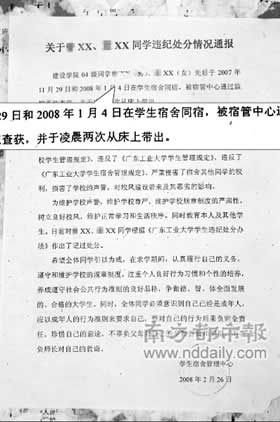1月4日,廣州大學城某工業(yè)大學一女生留男生在宿舍過夜被學校抓獲,兩人近日被學校記過處分。這是該校在大學城校區(qū)首次對男女同宿現(xiàn)象公