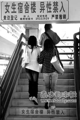 下午4點,記者在其中一棟男生樓進行了觀察。30分鐘內共有5名女生,從沒設門崗的出入口進入男生樓。1個手提快餐,準備上樓的女孩告訴記者,她常常到男生宿舍玩,“4年來好像只登記過1次,管理員極少上門檢查”。