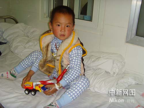 一名康復(fù)兒童在病床上高興地玩著手中的汽車玩具。張杰 攝