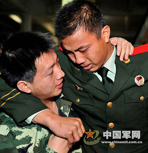 退伍回鄉(xiāng)的湖北籍戰(zhàn)士金帥(左)與前來送行的戰(zhàn)友依依惜別。新華社記者 張國俊攝