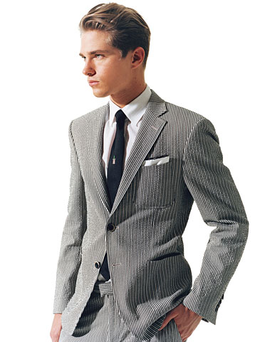 七:條紋外套?肯定!再發(fā)愁你的條紋西裝沒法穿么?的確,如今大概只有四歲的孩子和沒有時(shí)尚品味的人才會(huì)選擇那種淺色的泡泡紗外套來作為自己的“出場(chǎng)”服裝。但是,告訴你個(gè)方法,只要簡(jiǎn)單的加上黑色和白色的話,這款搭配就變得相當(dāng)?shù)挠行、成熟了。搭配白色的襯衫,黑色的領(lǐng)帶,和一塊口袋方巾,那么無論是日常的辦公或者是小型的PARTY聚會(huì),就都很合適了!