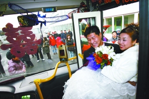 昨日,兩輛公交車成了一對(duì)新人的“重量級(jí)”婚車。新郎于浩是公交車司機(jī),新娘賈春穎是公交站調(diào)度員。新郎抱著新娘上車時(shí),司機(jī)說“先生請(qǐng)刷卡”。