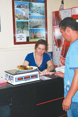 在正規(guī)的巴西飯店吃頓飯,至少要花幾十美元。即使是工作餐,一般也要20美元。相比之下,記者更喜歡去“公斤飯”餐館!肮镲垺焙苡邪臀魈厣,是按重量計(jì)費(fèi)的自助餐。餐館大多裝潢簡單,沒有菜譜?繅σ涣镩L桌上擺著各式飯菜,時鮮蔬菜、煎牛排、煮魚片、巴西特色煮豆飯、意大利面條以及水果甜點(diǎn),一應(yīng)俱全。顧客手持菜盤,將挑好的飯菜拿到電子秤上稱一下,然后按重量付款即可。