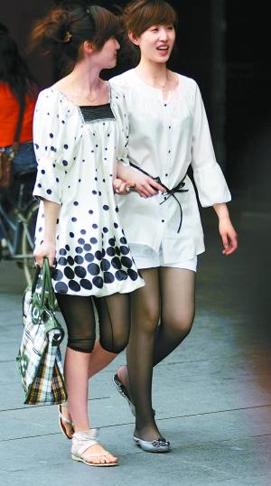 及膝短裙或牛仔短褲,配上黑色長(zhǎng)筒絲襪和一雙平底鞋,這是今夏北京街頭最I(lǐng)N的搭配打扮。黑色絲襪,在沉寂了多年之后,又重新受到時(shí)尚達(dá)人的追捧。