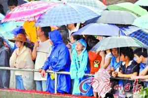 雖然昨天的賽事從頭到尾都在下雨,但這絲毫沒有影響人們的熱情,記者看到,整個聚龍村以及河堤的道路兩旁,均停放著大量的車輛,而在河堤上,更是人山人海,人們打著雨傘狂呼,給各自村的隊伍加油。而在河對岸的芳村海北村,也與聚龍村的河堤上一樣精彩,隔河相望,相互加油。