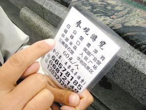 “一日游,60塊錢。馬上就可以走!币幻麐D女湊上來,還揚起手中的一張紙片,上面印有參觀行程:白公館、渣滓洞、磁器口或湖廣會館、環(huán)游半島、人民廣場、三峽奇石館、華巖風景區(qū)(含門票、車費、導游費)。