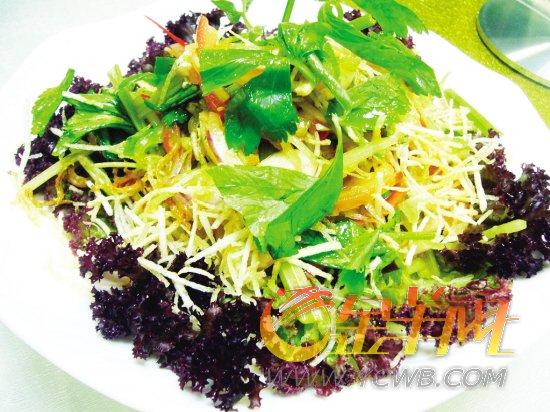 印尼黃姜具有祛濕、清熱解毒、治療動(dòng)脈硬化的作用,對(duì)心血管系統(tǒng)的疾病也有較好的療效。而南姜?jiǎng)t可以幫助消化、壯陽,具有振奮、活化肌膚與抗自由基等多重特性。將青瓜、西紅柿、芹菜、洋蔥均切成絲狀后,再加入特制的黃姜、南姜、辣椒(可根據(jù)自己的口味)涼拌而成的“絲絲入扣”,辣香清脆,既營養(yǎng),又養(yǎng)生美容。