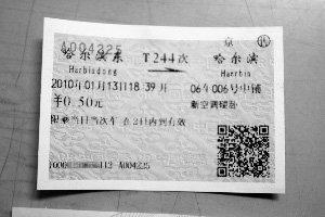 倪先生說(shuō),日前,他在論壇看到有人說(shuō)能買(mǎi)到這么便宜的火車票,覺(jué)得很好奇,就去了家門(mén)口的一家火車售票點(diǎn),買(mǎi)到了5毛錢(qián)的硬臥火車票,外加5塊錢(qián)手續(xù)費(fèi),“那個(gè)賣票的小伙子都震驚了,他都不知道有這么便宜的票!蹦呦壬,這兩站之間有八九公里,坐公交車按照當(dāng)?shù)貎r(jià)格得一塊錢(qián)吧。”記者看到,這是一張1月13日哈爾濱東開(kāi)往哈爾濱的T244次新空調(diào)硬臥中鋪票,價(jià)格處印著“0.5元”。倪先生說(shuō),他買(mǎi)這張票只為收藏,不會(huì)真的去乘坐。