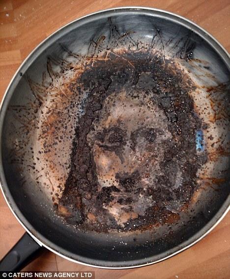 托比把燒焦的熏肉刮除后發(fā)現(xiàn),鍋中剩余的油漬痕跡就像是一張人臉,搭配頭發(fā)、胡子,看起來就跟耶穌沒兩樣。