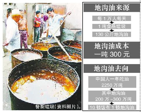 “你一定也吃過地溝油。”武漢工業(yè)學院食品科學與工程學院教授何東平對記者說。他的另一個身份是全國糧油標準化委員會油料和油脂工作組組長。據(jù)他估計,目前我國每年返回餐桌的地溝油有200萬~300萬噸。而中國人一年的動、植物油消費總量大約是2250萬噸——也就是說,按照比例,你吃10頓飯,可能有1頓碰上的就是地溝油。