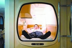 膠囊旅館的面積通常不會超過2平方米,高度僅有1.25米,人在里面無法站立,只能爬著進去。一床、一桌、一臺電視,基本就是膠囊旅館的全部家具了。墻壁上有一排電子開關(guān),用于控制燈光、溫度和音響設(shè)備。
